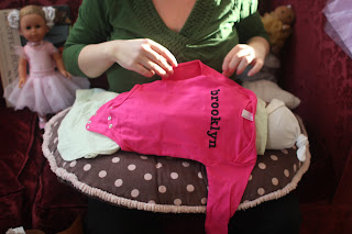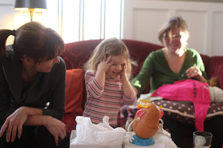 Christi and Margot were making muffins this morning - with Daphne the doll observing. Christi asked Margot to move Daphne out of the way so she wouldn't get messy... and a solution was reached.