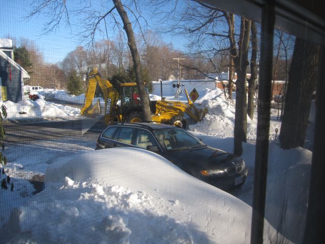 If you don't live near us, you might not know that we have gotten a lot of snow this month. Margot has had a snow day each week since the year started. We have huge piles of snow everywhere that is convenient to put them, but nowhere to put snow from the two new storms we're expecting this week. Our driveway plower came to the rescue. He rented a front-end loader and moved the piles of snow off to the side. This made for an exciting show while we ate our breakfast.