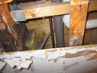 Here's the ceiling of the closet in the "library", under the second-floor bath. I think that's the steam pipe to the radiator (which BTW doesn't seem to heat, and is permanently beadboarded in).